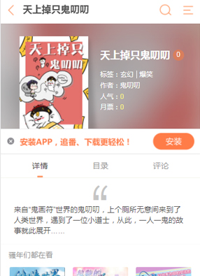 开始阅读 微信阅读 简介: 漫画《天上掉只鬼叨叨》讲述了有一个世界大家都不知道,他的名字叫做鬼画符。哪里生活的都是鬼魂,但是没想到一直安心在哪里生活的鬼叨叨。在上厕所的时候,居然就落入了人类的世界!!!还遇见了一位小道士?!!这个小道士的本领还是不错的,所以,鬼叨叨与他的故事开展了,一人与一鬼的刁蛮故事就开始了哟~~~ 本文固定链接: https://biqugem.net/hm/17856.html