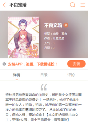 2025-06-15 14:59 开始阅读 微信阅读 简介: 漫画《不良宠婚》讲述了他是霸气十足的特种兵男神,傲气天下,可是偏偏宠妻如命,一次意外,就让她成为了他的唯一的女人!她所有的第一次都是属于他的。连晚上的的那一次,让他无情的霸道掠夺了!但是从此之后,他的生命中多了一个她,她就是他的心肝宝贝,当命一样爱护。且看这样的美少女如何征服高冷男生呢?