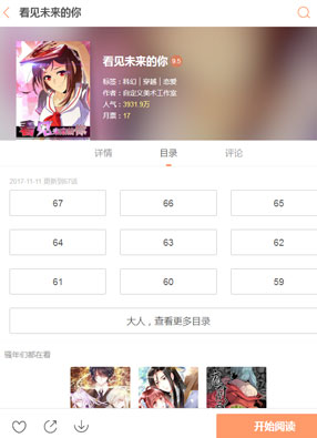 简介: 《看见未来的你》漫画简述:严子烈与一个相处了很久的女朋友,因为他一直对研究和数据的过度重视,导致了对自己女朋友的忽视。某天,他的女朋友特意过去找她,严子烈却因为一场数据而对她大发脾气,导致她在过马路的时候被车给撞了,为了挽回这一切,严子烈骑上了时空穿梭的车子,穿越数十载,困在过去的时代,只为拯救深爱着我的你……可没想到,所有的原则在见到你的那一刻几乎都化为泡影……